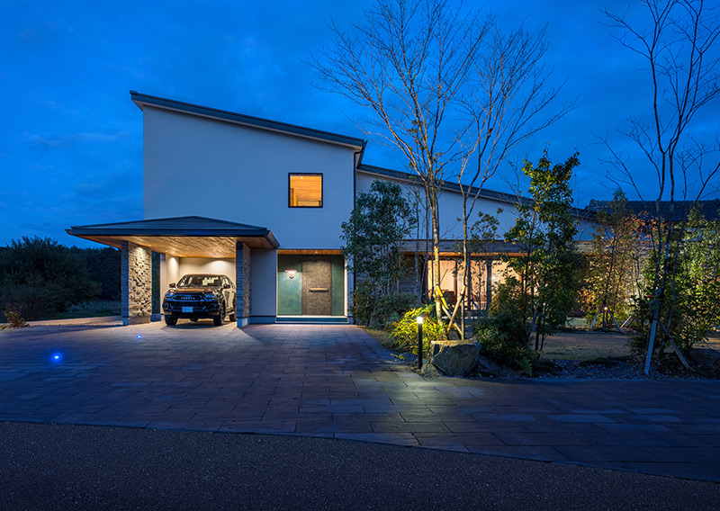 深い青に染まる夕暮れの空の下、室内からこぼれる柔らかな灯りが住まい全体を静かに包み込む。自然と寄り添う植栽や落ち着いた外観が日常の喧騒を忘れさせ、帰るたびに心を整えてくれる。時間の流れさえ穏やかに感じられる。