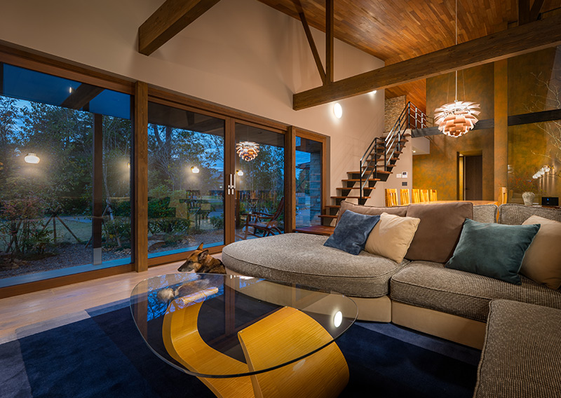 大きな窓の向こうに広がる夕景と、木の梁や床が醸し出す温もりが心地よく調和したリビング。柔らかな照明が空間に奥行きを与え、家族やペットと過ごす時間をより豊かにしてくれる。自然と一体となり、日常を特別なひとときへと変える。