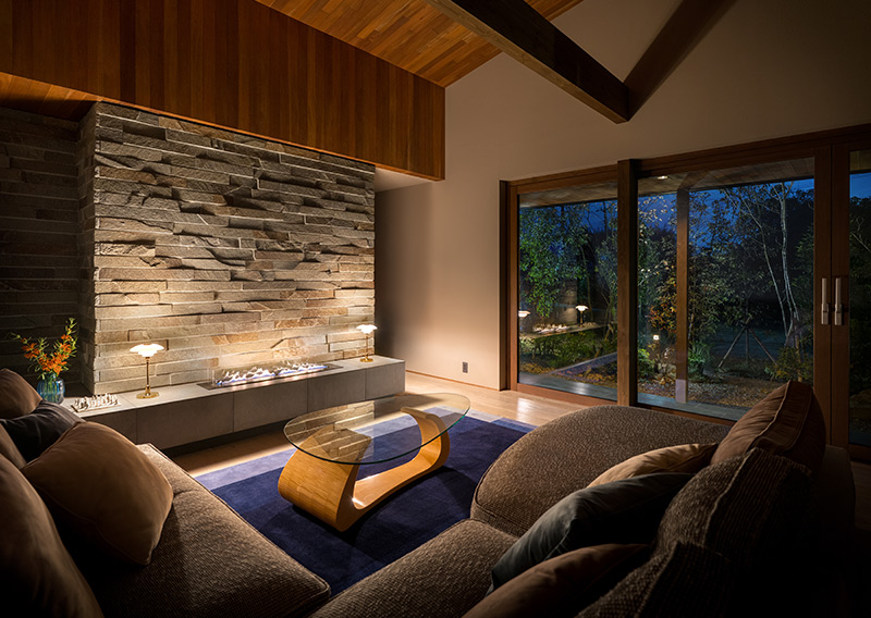 重厚感のある鉄平石壁と、炎のゆらぎが静かに寄り添う上質なリビング空間。木の天井や梁が温もりを添え、大きな窓の先には夜の庭が広がる。照明を落とせば、素材の表情と陰影が際立ち、心を解きほぐす特別な時間がゆっくりと流れていく。
