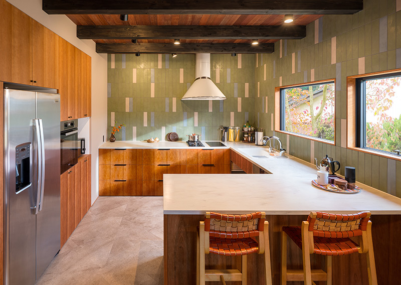 リビングとは程よく距離を保ち、料理に集中できる独立したキッチン空間。木の質感を生かした造作収納と落ち着いた色合いのタイルが、機能性と美しさを両立させる。窓から差し込む自然光が手元を明るく照らし、日々の調理時間を心地よく、豊かなひとときへと導いてくれる。