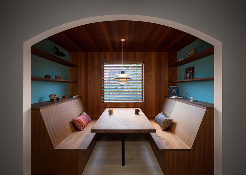 キッチンに隣接したブレックファーストヌックは、1日の始まりを穏やかに迎えるための特別な居場所。包み込まれるようなアーチ形の空間と木の質感が落ち着きを生み、家族だけの親密な時間を育む。朝食やコーヒータイムはもちろん、読書や会話を楽しむひとときにも心地よく寄り添う空間。