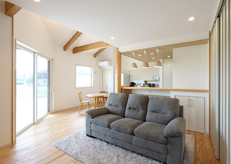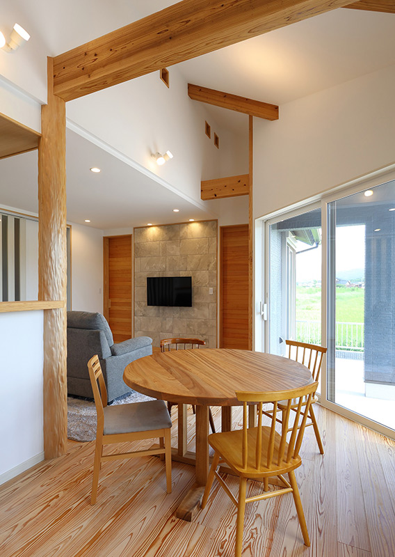 大きく開口した窓から田園風景が望めるLDK。木の節が苦手という奥様に配慮して、床に張った無垢のスギは、木の中心に近い無節の部分を全面に採用。