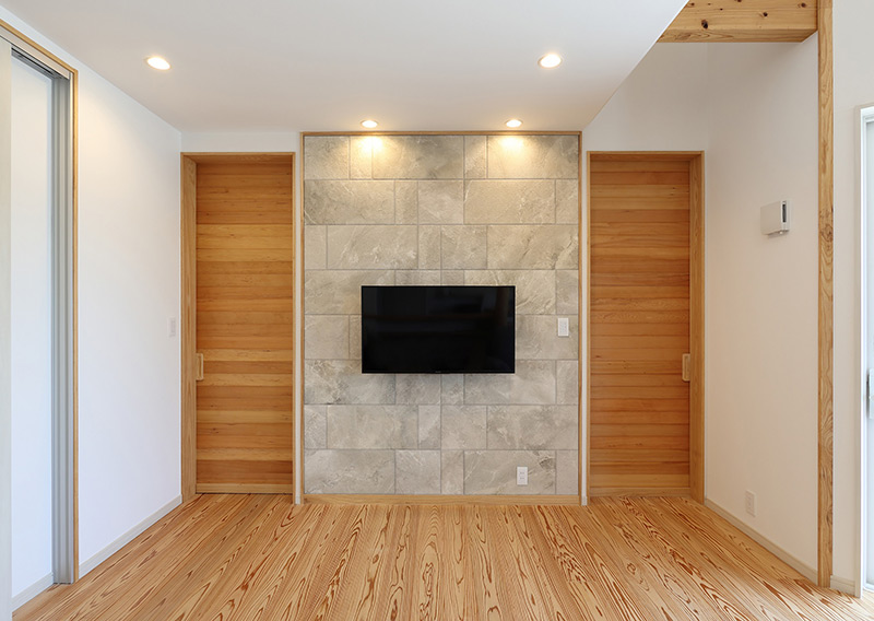 向かって右側のドアは引き戸に見えますが、実は「開かずの扉」というご主人の遊び心を形にしたもの。うづくり仕上げで足触りの良い床は、無垢板の木目が偏ることなく、バランスや連続性を考えて張るという細やかな仕事が施されています。
