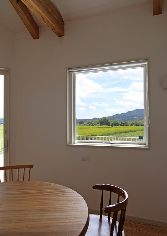 空と山、田んぼが織りなす田園風景を切り取るピクチャーウインドウを、ダイニング横に開口しました。
