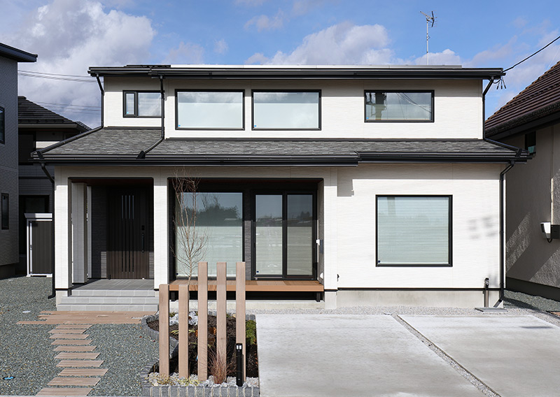 水平ラインを意識した端正な外観と抑えた高さ計画により、住まいに落ち着きと安定感を与えています。軒の出がつくる陰影と穏やかな色調が建物の表情を柔らかく整え、周囲の街並みに自然に調和する佇まいとしました。過度な主張を避け、長く住み継がれる普遍性と品のある外観デザインを大切にしています。