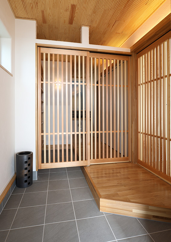 玄関の天井には南部赤松を用い、杉材で造られた格子戸は木の風合いが緩やかに目隠しとなります。奥に手洗いコーナーを設け、日常動線や衛生面にも配慮しています。格子戸が外側と内側を柔らかく区切り、閉鎖感のない空間を生み出しています。