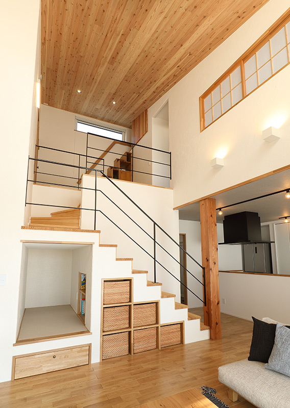 吹き抜けと階段がつくる大空間の中で、階段下を収納や小さな居場所として活用し、空間を余すことなく使うことで暮らしの豊かさを高めています。家のどこにいても家族の気配を感じられるよう、温かくつながりのある空間としました。