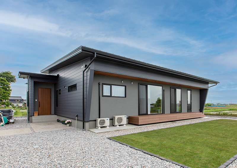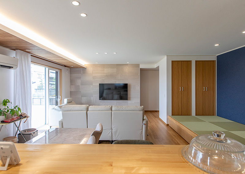 落ち着いた色彩と木のぬくもりが調和する、上質な平屋スタイル。小上がり畳スペースを中心とした開放感あふれる大空間に、自然と家族が集まります。家族の輪が広がり、心豊かに過ごせる住まいとしました。