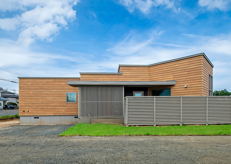 重なり合うボリュームがリズムを生み、木製ルーバーが奥行きをつくります。視線を遮り、光を取り込む機能美。