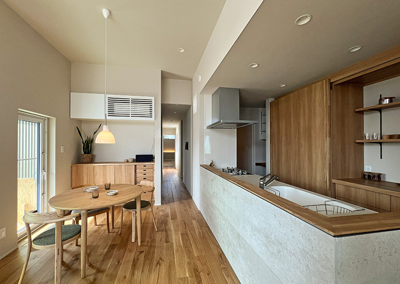 無垢材フローリングの温もりと、モルタル調キッチンの無機質な質感。素材の対比が空間を引き締めます。