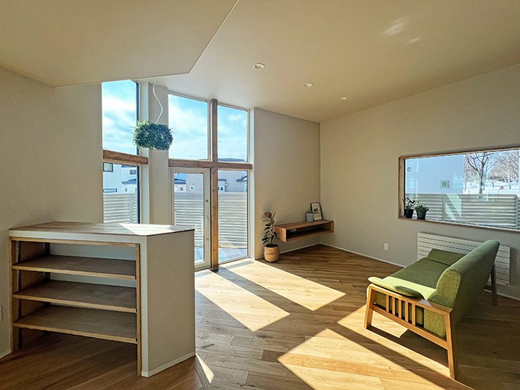 小上がりと高天井の高低差が、心地よい開放感を生みます。視線が自然と外の空へ広がります。