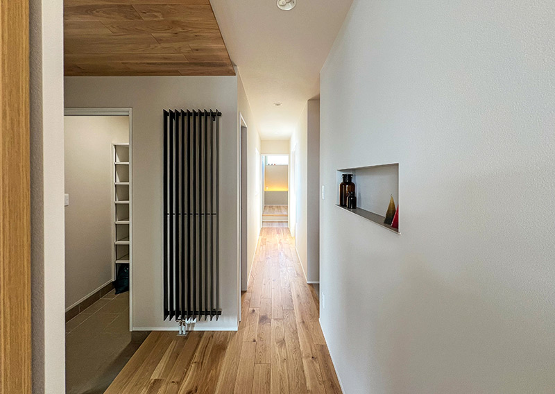 無垢板張りの玄関天井が温かく迎えます。ダイニングの賑わいから寝室の静寂へ。オンとオフを緩やかにつなぎます。
