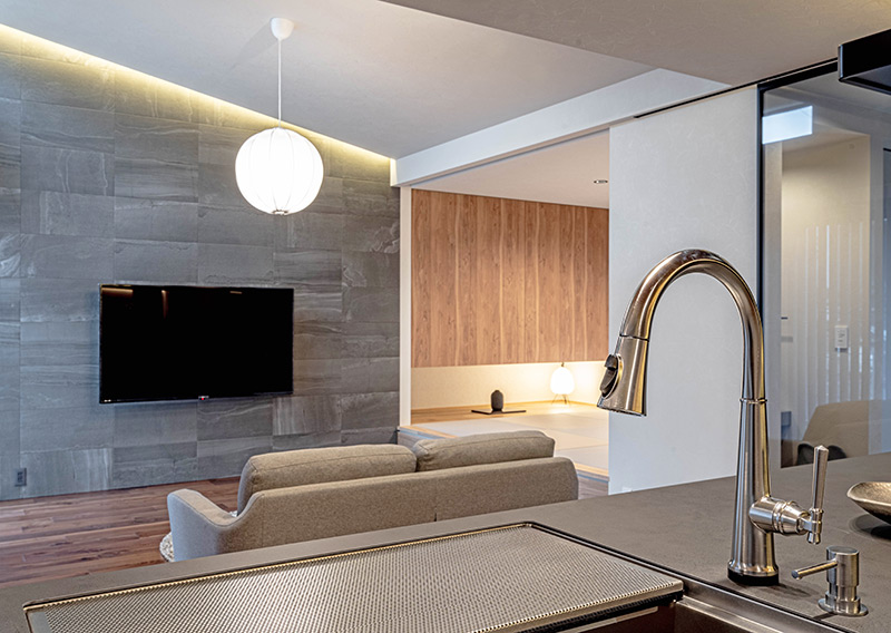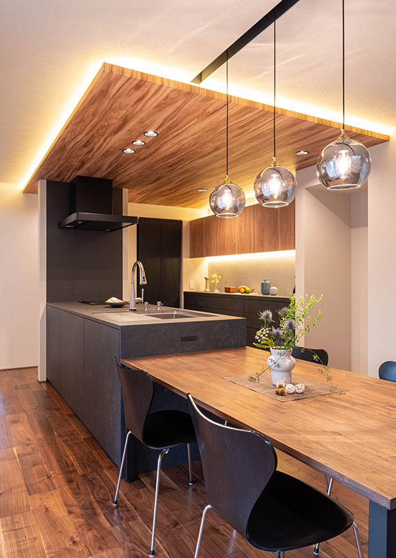 回遊動線の終点をDKに設定。ウォルナット×タイル×黒の素材構成を、間接光と多灯照明で美しく整えています。