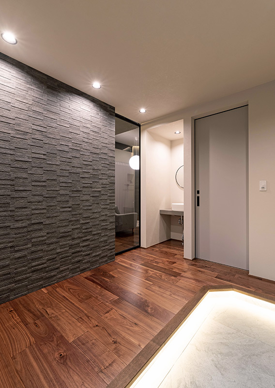タイルの質感を陰影で際立たせた“入り”の空間。静けさのある迎え入れを意図しました。