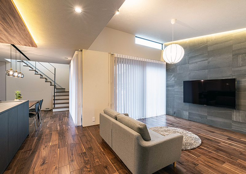 エントランスからSCL・WIC・ユーティリティを経てDKへとつながる回遊動線を整え、暮らしの中心をキッチンに。ウォルナットとタイル、黒で空間を引き締め、間接照明と多灯使いで必要なところに必要な光だけを配置しました。水平ラインが翼のように広がる外観から、「Wing」と名付けた住まいです。