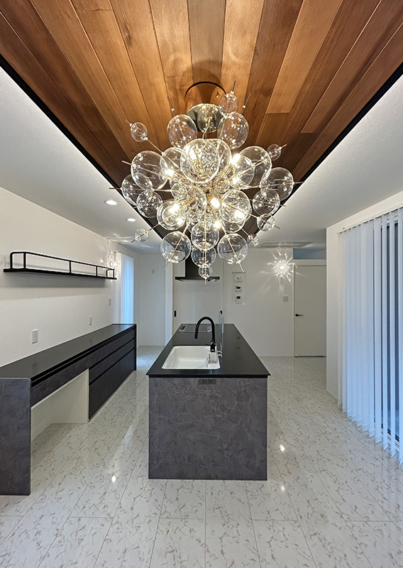 造作天井にはレッドシダーを採用。奥様お好みの照明デザインに合わせて設計し、木目と光が美しく調和する印象的な空間に仕上げました。