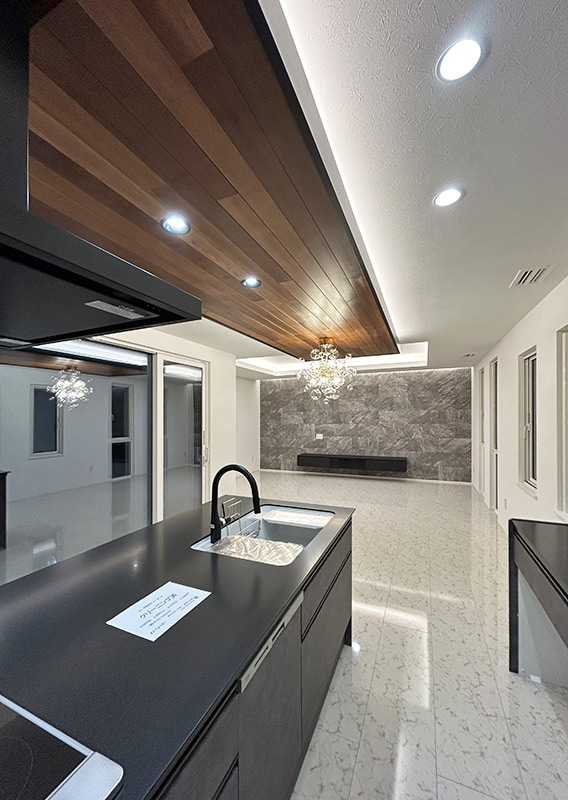 広々としたLDKは白を基調に、石目タイルを施工。床はあえて艶ありの大理石調フロアを選び、ラグジュアリーな高級感を演出しました。想像以上の存在感です。