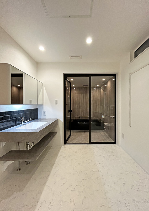 造作洗面台と間接照明、さらに透明感のあるUBガラスでホテルライクな雰囲気に。生活感が出やすい空間だからこそ、垢抜けたLUXEスタイルを徹底しました。